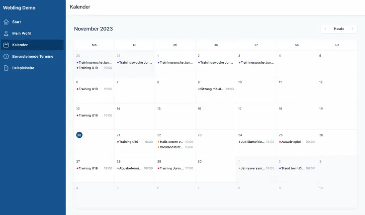 Der Terminkalender ist in das Mitgliederportal von Webling integriert. In diesem Intranet haben deine Mitglieder den Überblick: Informationen vom Vorstand, News und Termine. Über den Vereinskalender melden sich die Mitglieder selbstständig zu Veranstaltungen an und ab.